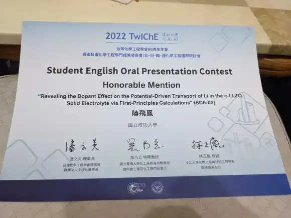 Congrats to our graduate student, Phoenix Lu (陸飛鳳), for being awarded the Honorable Mention for the Student English Oral Presentation Contest (英文報告口頭競賽佳作) in the 2022 TwIChE annual meeting (台灣化工年會).