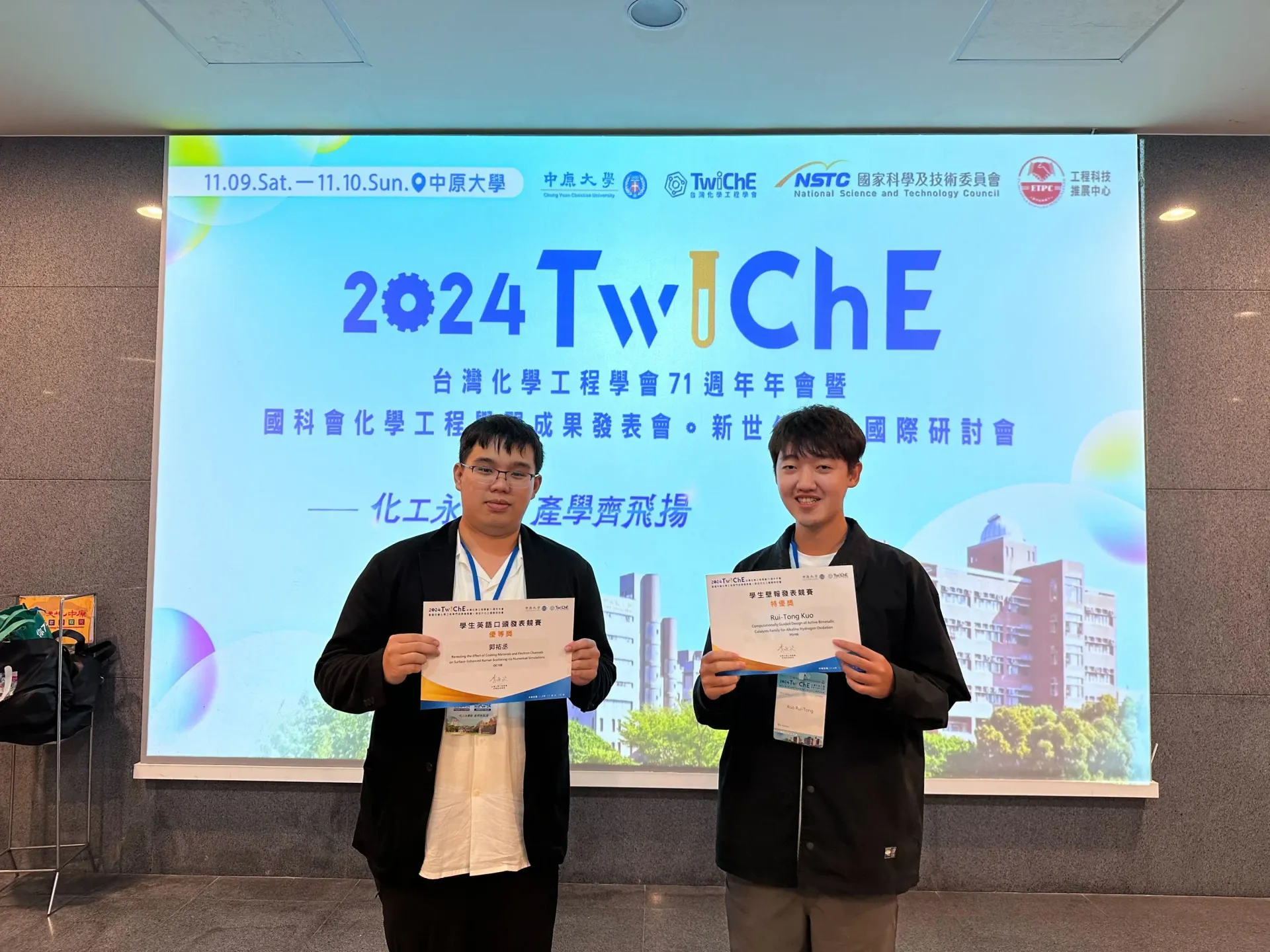Congrats to our Master students (M1), Yu-Ting Tai (戴郁庭) and You-Cheng Kou (郭祐丞), for getting direct admissions to the Ph.D. programs (逕讀博士班) of the Chemical Engineering (化工所) and the Program of Smart and Sustainable Manufacturing (智慧與永續製造學程), respectively, at NCKU with Ph.D. scholarships.
