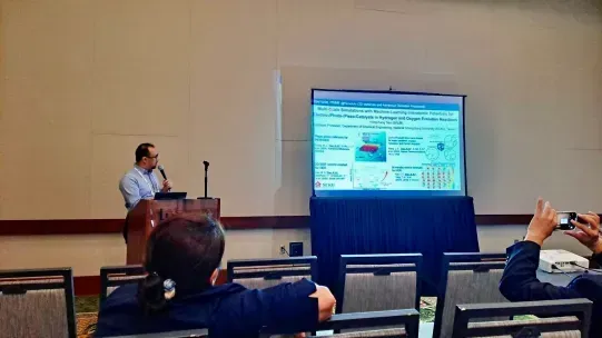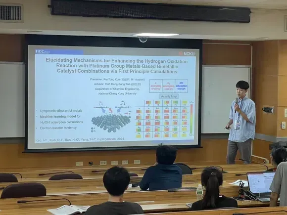 Prof. Tian was invited to give a talk at TICC2024 in NTUST. Also, Rui-Tong Kuo gave an English oral presentation about activity predictions of bi-metal catalysts via first-principles calculations and machine-learning potential. Also, Prof. Tian was glad to reunite with his Master’s degree advisor, Prof. Ben-Zu Wan.