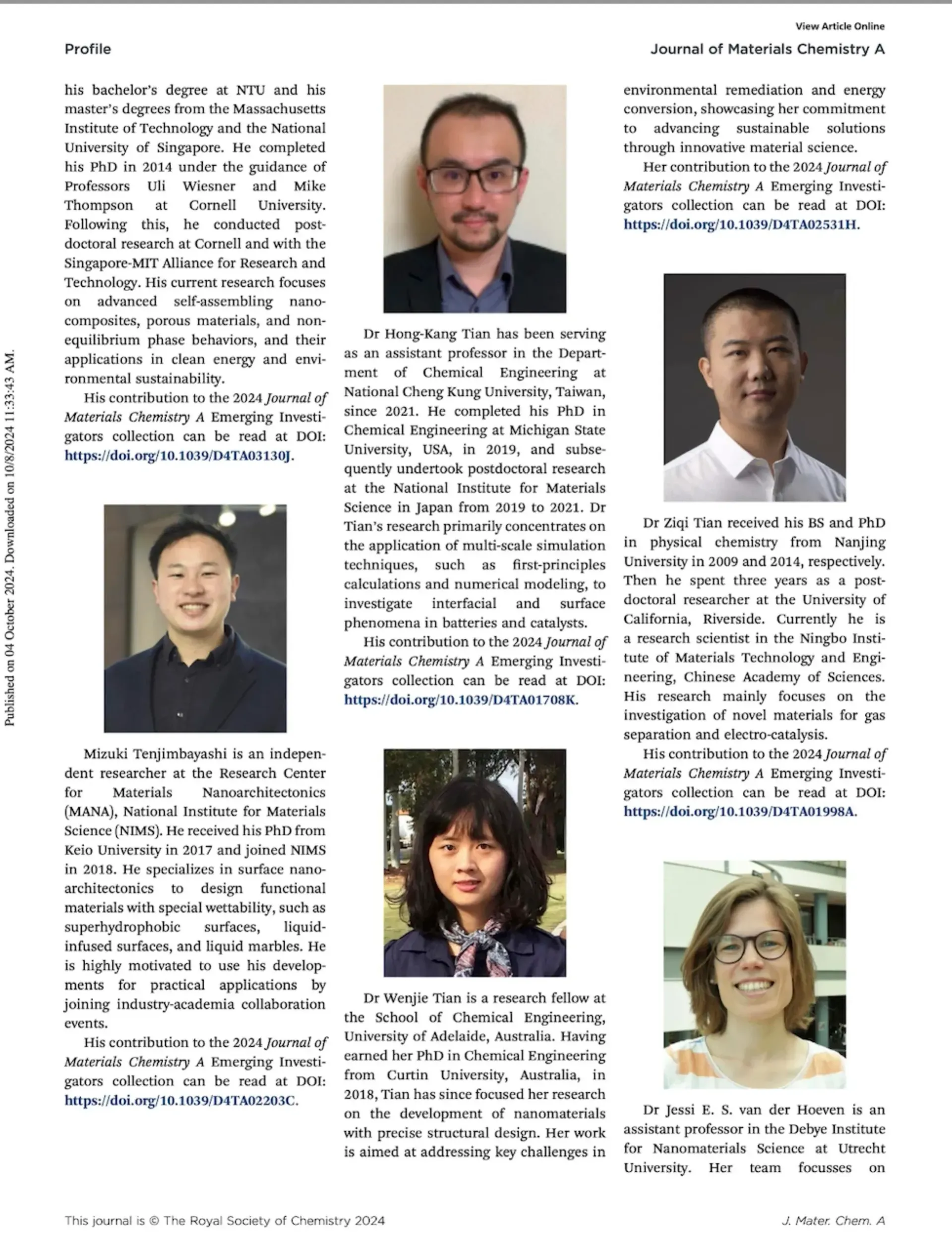 Congratulations to Prof. Tian on being selected as an Emerging Investigator by the Journal of Materials Chemistry A (IF: 10.7).
